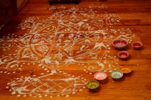Aripan are floor paintings in Mithila made with Rice paste and Vermilion dots by the fingers. Aripans are made on all rituals and festive occasion in Mithila. Here, Ashtdal Kamal (style of Lotus ) Aripan is made on the hardwood floor near the Mandir as a part to welcome the Goddess as part of Maithil traditions.
