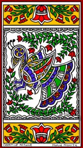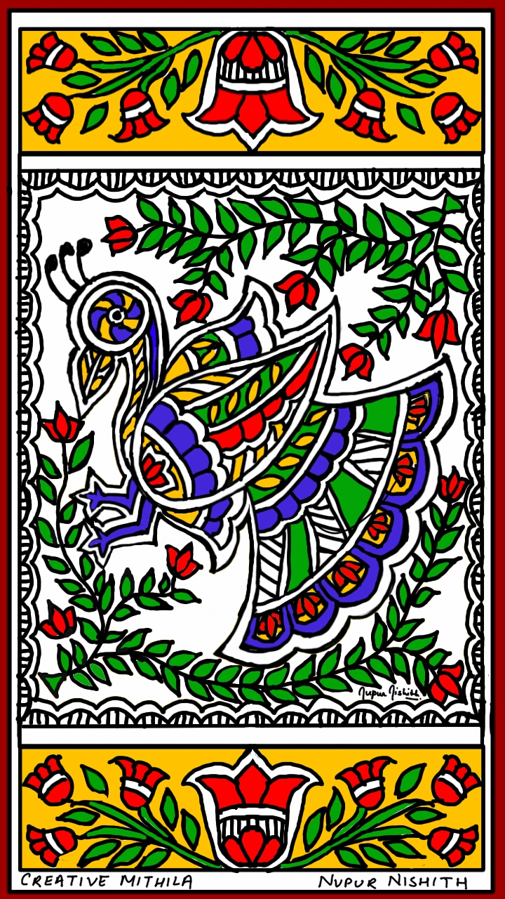 The painting is of peacock along with the motifs of flowers and leaves in background and borders in the theme of Mithila / Madhubani Paintings.